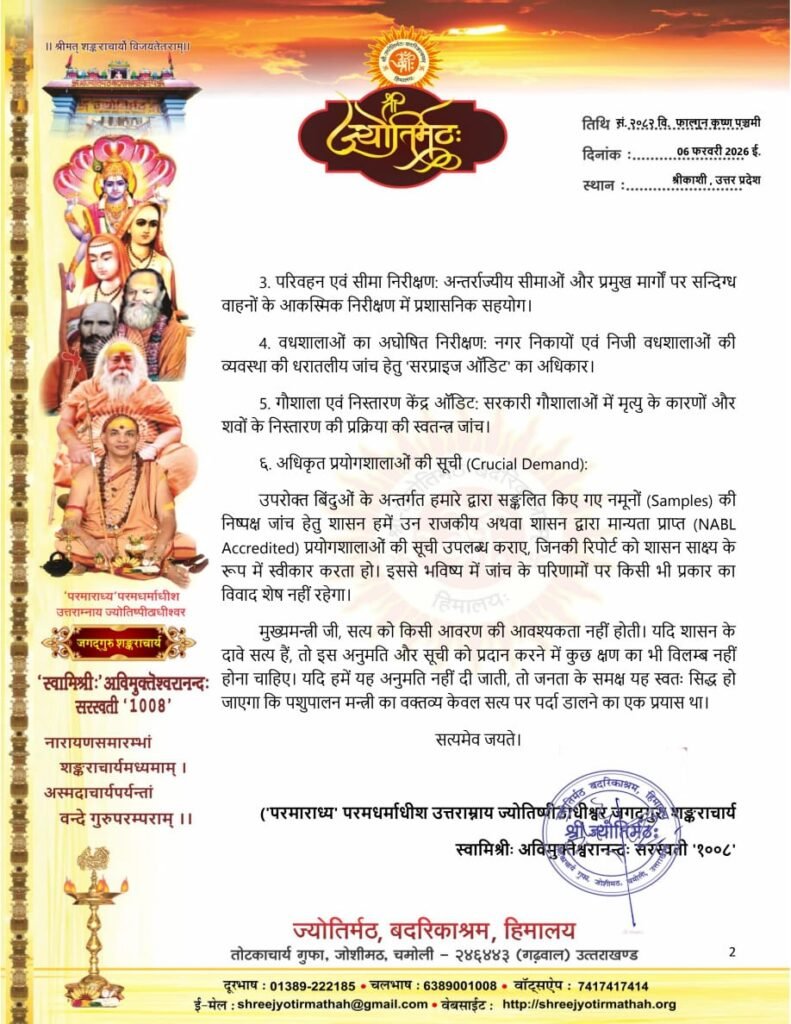 वाराणसी। विगत दिनों उत्तर प्रदेश के पशुपालन मंत्री द्वारा राज्य में गो-वंश को पूर्णतः सुरक्षित बताने और गोकशी की घटनाओं को ‘भ्रम’ व ‘असत्य’ करार देने वाले वक्तव्य पर ज्योतिष्पीठ के जगद्गुरु शंकराचार्य स्वामिश्री: अविमुक्तेश्वरानन्द: सरस्वती ‘१००८’ ने कड़ा रुख अपनाया है। पूज्य महाराजश्री ने माननीय मुख्यमंत्री को पत्र लिखकर राजसत्ता के दावों को धरातल पर सिद्ध करने के लिए ‘ज्योतिष्पीठ’ के प्रतिनिधियों को स्वतंत्र जाँच और ‘प्रमाण संकलन’ की अनुमति देने की मांग की है।